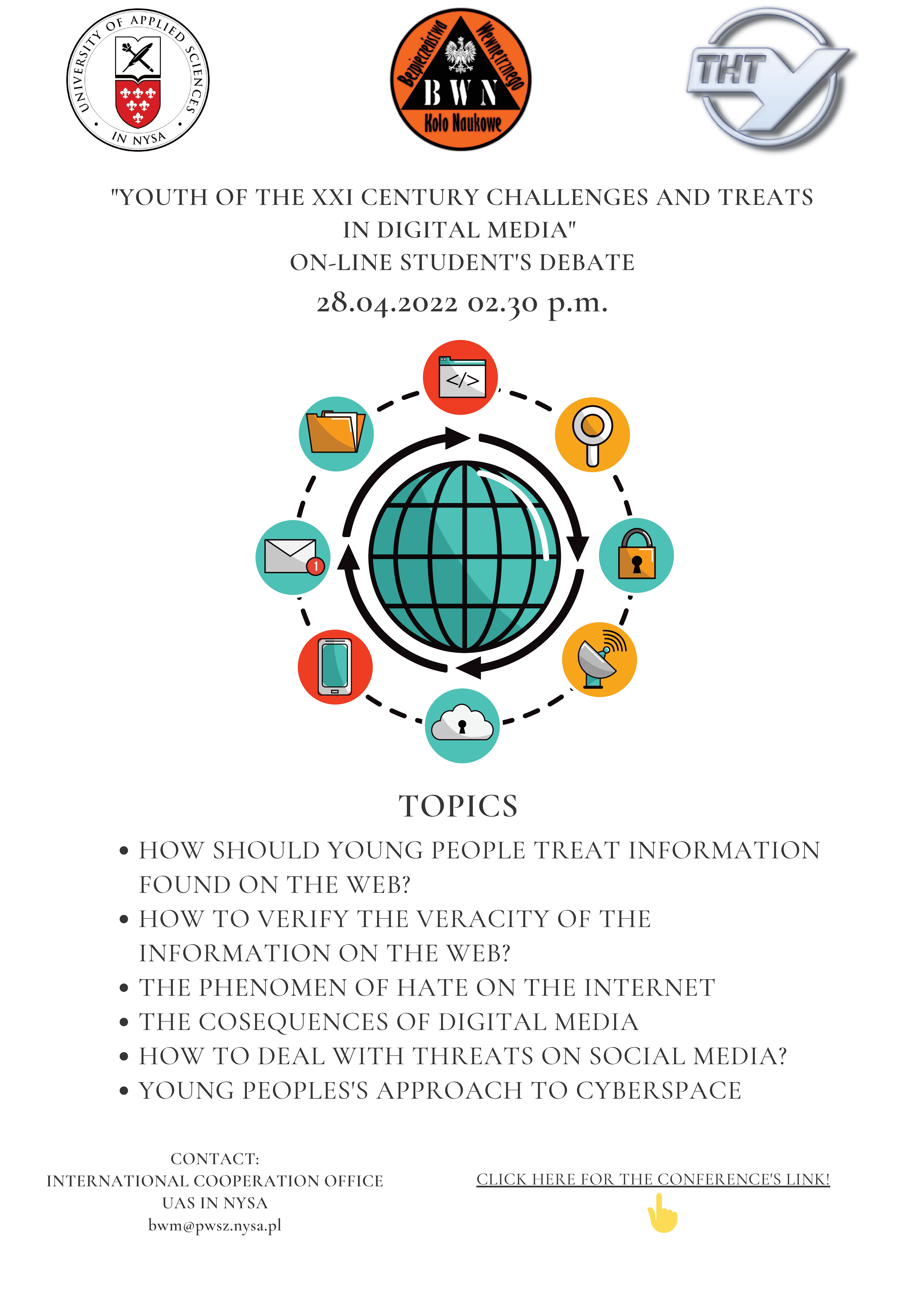 Dnia 28 kwietnia 2022 roku o godzinie 14:30 na platformie Microsoft Teams odbędzie się międzynarodowa debata na temat: „Młodzież XXI wieku. Wyzwania i zagrożenia w mediach cyfrowych”. Debata jest organizowana przez Studenckie Koło Naukowe „BWN” działające na Wydziale Nauk Społecznych w Państwowej Wyższej Szkole Zawodowej w Nysie. Partnerem debaty będzie Narodowy Uniwersytet Techniczny im. Tarnopola Ivana Puluj na Ukrainie. Całe wydarzenie odbędzie się w języku angielskim. W debacie weźmie również udział Koło Naukowe „FENIX”.