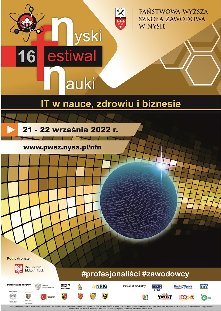 „IT w nauce, zdrowiu i biznesie” - pod takim hasłem w dniach 21- 22 września 2022 r. organizowany będzie Nyski Festiwal Nauki w Państwowej Wyższej Szkole Zawodowej w Nysie. Na XVI edycję Festiwalu przygotowano wiele atrakcji promujących naukę. Będą to wykłady, prezentacje, pokazy, ćwiczenia, laboratoria, wystawy i konkursy.