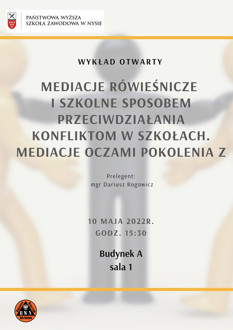 10 maja 2022 roku o godzinie 15:30 w sali nr 1 budynku A naszej Uczelni odbędzie się wykład otwarty na temat: „Mediacje rówieśnicze i szkolne sposobem przeciwdziałania konfliktom w szkołach. Mediacje oczami pokolenia Z”. Prelegentem wykładu będzie Pan mgr Dariusz Rogowicz. Wykład jest zorganizowany przez koło naukowe BWN, działające na Wydziale Nauk Społecznych.