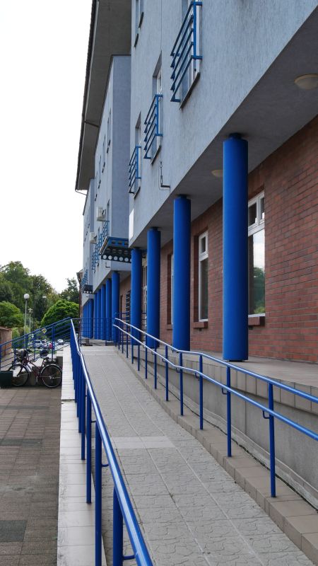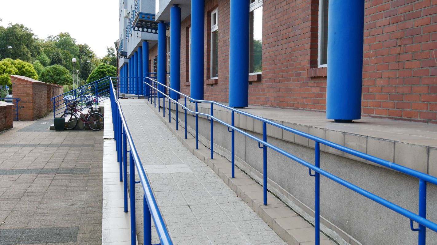 - obiekty uczelniane wyposażone są w: podjazdy, windy, podnośniki przychodowe, a budynki oznakowane poprzez wskazanie kierunku wejścia dostępnego dla osób ze szczególnymi potrzebami