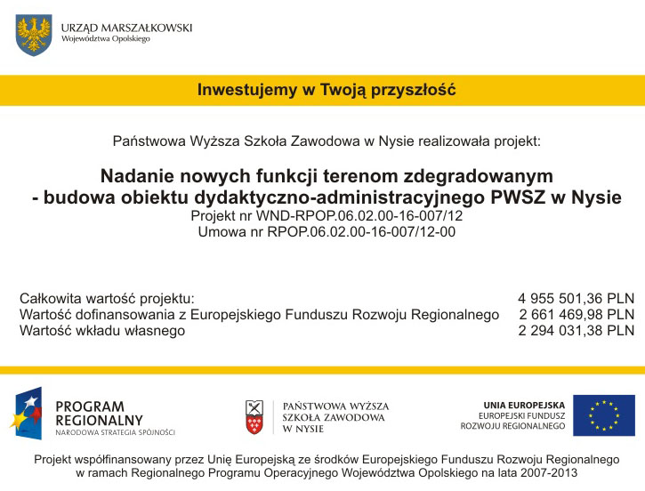 Tytuł projektu "Nadanie nowych funkcji terenom zdegradowanym – budowa obiektu dydaktyczno administracyjnego PWSZ w Nysie "