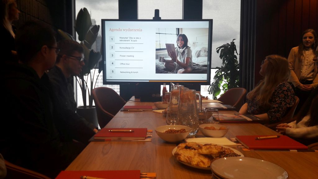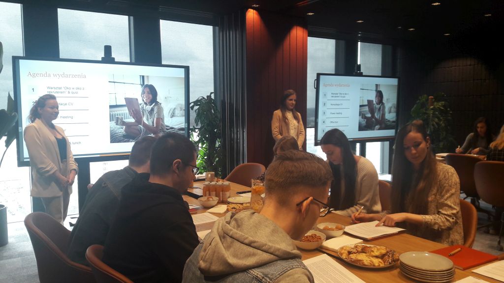 W trakcie wizyty pracownicy przedstawili firmę tj. informacje o jej funkcjonowaniu, zarządzaniu, strukturze wewnętrznej, omówili możliwości edukacji i kariery.